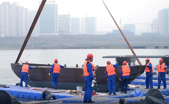 四川南充市"印象嘉陵江"大型钢结构浮船式文化创意浮桥施工现场